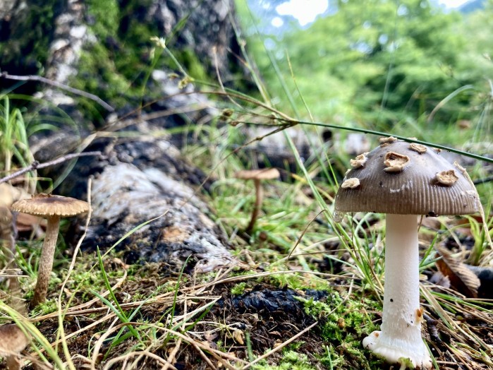 河童橋から明神までの、梓川左岸道は、しばし笹が脇に生えている林の中を歩きます。笹の中をかき分けると、こっそりキノコが!
